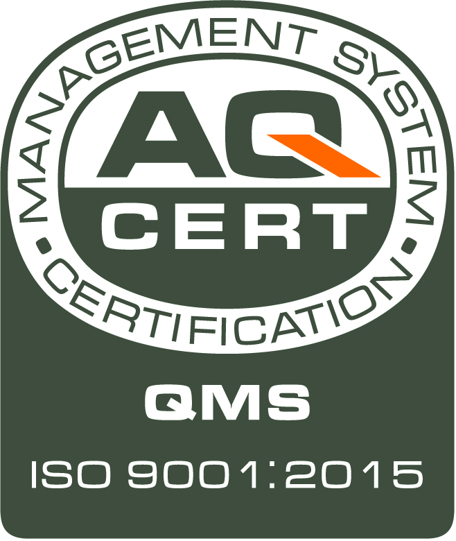 L'azienda è ufficialmente certificata in conformità alla norma ISO 9001:2015 da AQ Cert (Alpha Quality Certification).